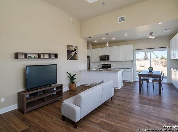 Explore this Hill Country modern 3-bedroom, 2-bath home available for lease. As you enter, you'll be welcomed by a spacious living room that seamlessly connects to the kitchen and breakfast/dining area. The kitchen boasts ample cabinet space, featuring a built-in buffet that enhances the dining experience. All bedrooms are nice size, with the master suite offering a private bathroom equipped with a double vanity. The home showcases beautiful wood tile flooring throughout. Enjoy the convenience of a large carport, providing shelter for your vehicle. Please note that the road leading to the property transitions to gravel.
