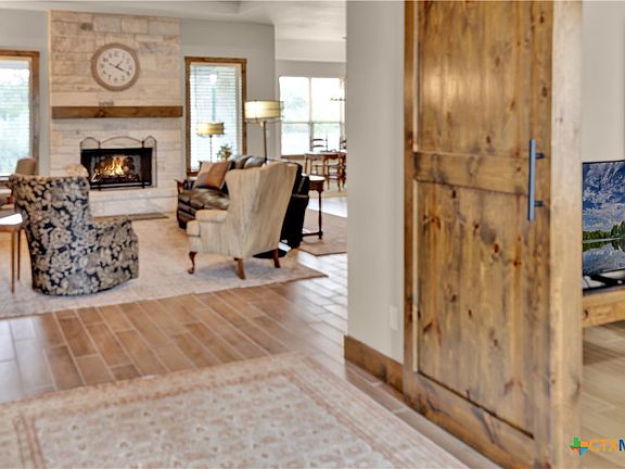 Stone fireplaceGas ovenOpen floor planRaised tiered ceilingImpressive studyGas cook topLarge island
