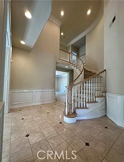 Elegant stairwayFamily roomCrown moldingDining roomRecessed lightingDouble door entryGranite kitchen counter tops