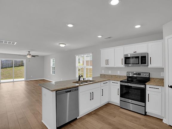 Stainless appliancesOpen-concept designCovered porch with fanLvp flooringVaulted ceilingsWhite cabinetryDual sinks