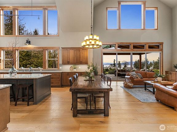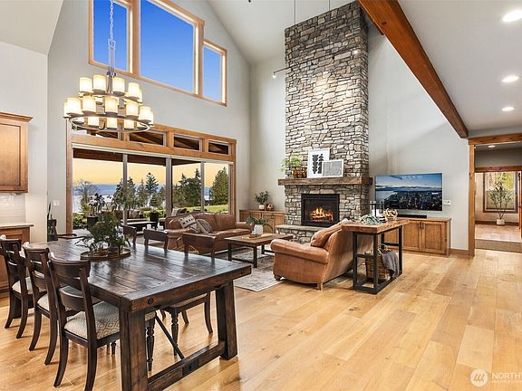 Premier gated community on North end w/private community beach and tidelands. Exceptional NW contemporary lodge style home w/stunning views of Mt. Baker/Skagit Bay. Handsome 3,951 sq ft residence showcases craftsmanship throughout: granite counters, hardwood floors plus built-ins & cabinets that blend style w/function. 20’ vaulted ceiling creates casual elegance. Striking stonework nat’l gas FP is mirrored by the kitchen alcove’s cooking zone. Thoughtfully positioned windows capture the view from every room. Covered patio w/FP to entertain. Benefit from energy efficient solar PV. Fenced garden complements a shy 5 acres. Double deep garage & barn w/RV port. Enjoy boating & beach activities. This is NW living at its finest.