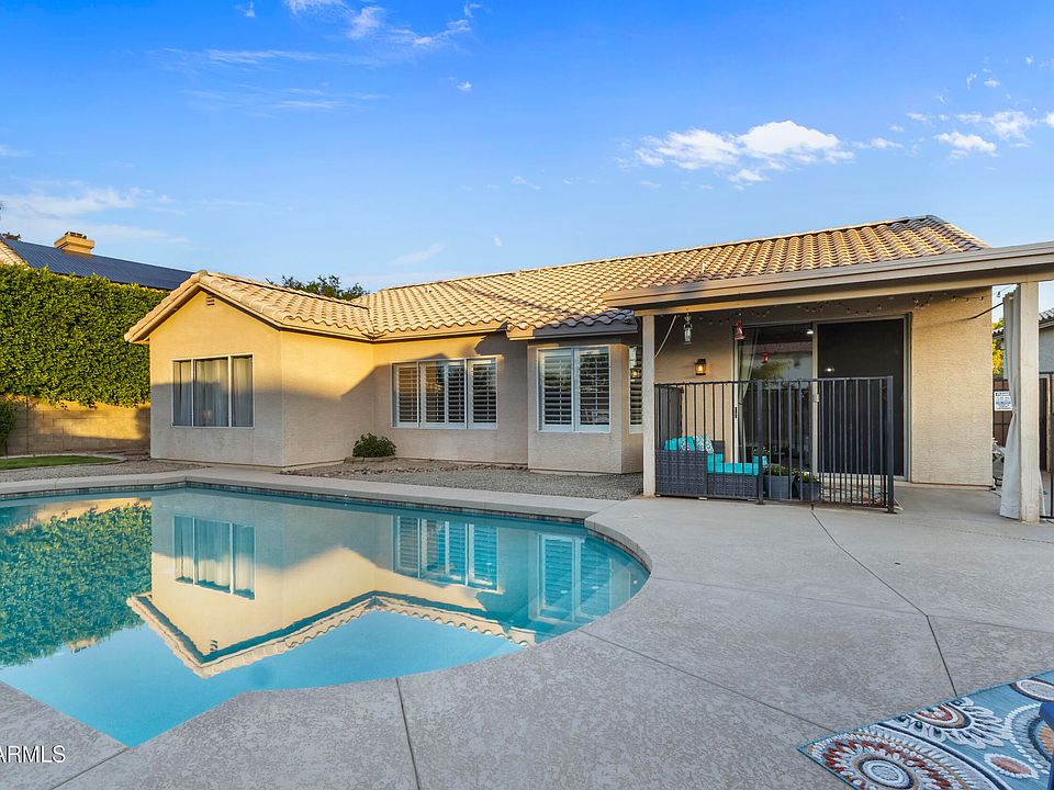 Mere minutes away from Downtown Gilbert, this single level stunner is perfect for all your needs. New Roof and HVAC provide you peace of mind for years to come. Vaulted Ceilings, Quartz Countertops, Shutters and LVP throughout are a few of the additional upgrades. From entertaining to intimate gatherings, you will love the backyard, offering a perfectly sized pool, lush lawn and conversation area. Your Formal Dining includes a bay window and open concept, directly off living area. The Kitchen includes breakfast bar and new appliances, situated just off the dining nook and family room. The master retreat includes an updated walk-in shower and separate soaking tub along with dual sinks and a walk-in closet. Enjoy nearby playgrounds, 3 fishing ponds and paved trails offer fun for everyone!