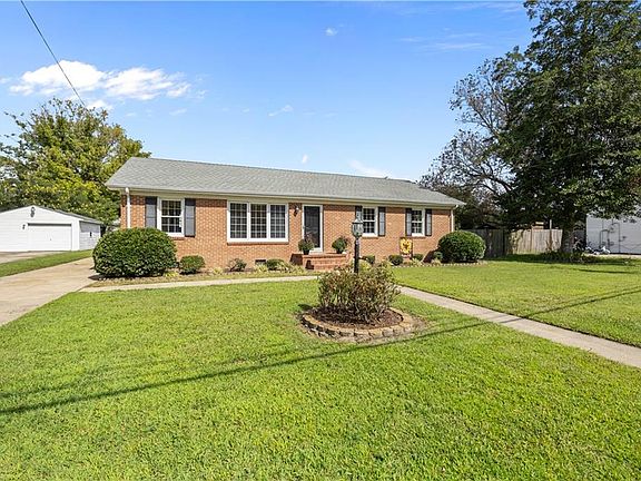 Charming one owner brick ranch in a sought after Suffolk neighborhood featuring three bedrooms and two full baths. Fresh paint ~ New fixtures ~ New 200 amp electrical panel in the house and new panel in the detached garage ~ New electrical outlets and switches ~ Completely remodeled primary bath in summer '25 ~ Hardwood floors throughout much of the floor plan. The property includes a spacious 26.5' x 26.6' two car detached garage with a floored attic for extra storage. Enjoy access to the neighborhood boat ramp on the Nansemond River, and easy access to all of Hampton Roads via nearby Route 58.