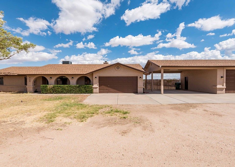 Centrally located horse property that offers 3 Bedrooms, 2 car attached and a 3 car detached garage with drive through door! This home is situated on a 1 acre parcel, a double carport and wood burning fire place! Other important features and upgrades include: *Landscaping on timers *Double carport *New exterior paint * New AC unit *New roof *Ceiling fans *formal dining with bay window *Breakfast bar *Large master bedroom with tub/shower *Indoor laundry with built in cabinets and washer and dryer *Large covered patio * Basketball court *Dog run *Block wall fencing.
