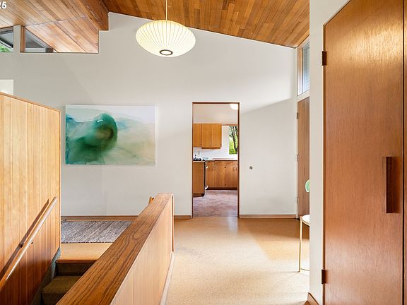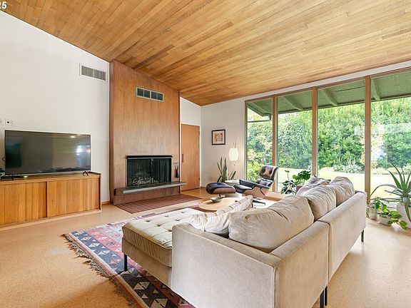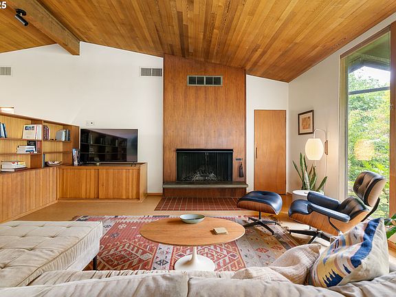 Rare, custom Northwest Regional Style mid-century modern home, built by its original owner Elwyn Kinney of Barnard & Kinney Construction, renowned for their detailed craftsmanship with projects at Salishan and the Japanese Gardens. This unique residence has high quality, well preserved original woodwork throughout, including vintage built-in bookcases & dressers, and beautiful wood-paneled walls that exude warmth and character. Stunning vaulted wood-clad ceilings throughout the main floor living room and kitchen with clerestory windows washing the living space with natural light showcasing the beautiful warmth of the natural wood. The living room also features cork flooring, floor-to-ceiling windows that bring the outdoors in overlooking the lush and meticulously landscaped backyard. The wood-wrapped fireplace is a work of art with a floating concrete bench and vintage tile hearth. The light and airy kitchen is open to the casual eating space with intelligent built-ins throughout. The primary suite offers cork flooring, vaulted wood ceilings, and large windows with serene nature views. The main level includes three total bedrooms, with an additional bedroom and full bath on the lower level. The lower level also features a spacious great room with high ceilings, polished concrete floors, and flexible storage/work spaces. Enjoy year-round outdoor living on the large covered patio within the fully fenced backyard, surrounded by established landscaping featuring a perfect blend of mature Japanese maple trees and grapevines. Aggregate stairs lead to the inviting entrance, complemented by an attached double car garage and a large driveway for off street parking. Located on a dead end street, a half block to Kennedy Park and around the corner from Kennedy community gardens, this home offers easy access to nature and community. Benefit from Washington County taxes and Beaverton schools, all while being minutes away from downtown Beaverton, Nike, Portland, and Jesuit.