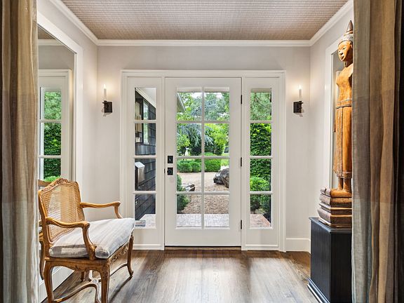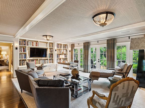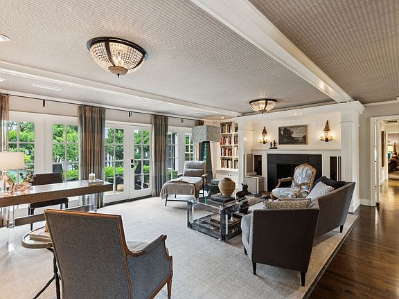 This Cape Cod-inspired Shingle Style home in Midway Hollow sits on a rare cul-de-sac, offering unmatched privacy on a half-acre estate lot. Lush landscaping with towering pines, Atlas cedars, and vibrant foliage creates a park-like setting. Pea gravel replaces traditional concrete for all driveways, paths, and open spaces. Inside, formal living and dining rooms connect to a high-end kitchen featuring a Sub-Zero refrigerator, Fisher Paykel drawer-style dishwasher, and GE Monogram dual-fuel range. Glass-front cabinets, soapstone countertops, and generous storage add to its charm. The dining room boasts Timorous Beasties wallpaper with silver leaf accents, complemented by relacquered woodwork and a grass cloth ceiling. The guest room is a fantasy retreat with Jakob Schaepfer wallpaper and luxurious layered textiles. Venetian plaster details enhance the appearance of the powder bath, master suite, and hallway, with ivory walls matched to the newly lacquered woodwork. The elegant living room, framed by French doors and terrace views, is lined with bookshelves and relacquered woodwork. The screened outdoor living space features vaulted ceilings, air conditioning, and a gas fireplace, while an adjacent cabana with a half bath provides easy pool access. The backyard is a sun lover’s paradise with a custom stone-lined 45-foot pool and spa, surrounded by lush greenery. A spacious garage with modern cabinetry accommodates three cars, completing this East Coast Hamptons-inspired haven—truly a one-of-a-kind Dallas gem!