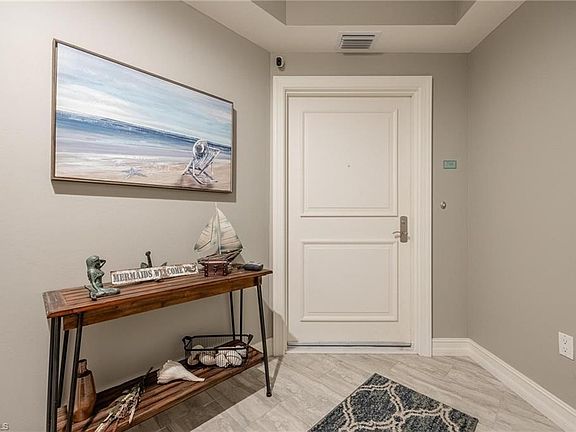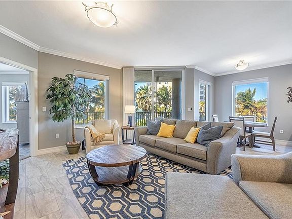 HUGE PRICE IMPROVMENT !! Come and see this absolutely stunning, light & bright, third-floor 3 bedroom, 2 bathroom residence in the Premier Luxury Community of Waterside! This unit is sold turnkey with beatifully tasteful, modern furnishings so all you need is your toothbrush! Entertaining is elevated in this corner unit that offers one of the largest lanais in the building with tropical views of the resort pool! An elevator opens to your private entry foyer before you enter... Inside you'll find a wide open and spacious living area and outdoor space. You'll love the gorgeous, updated kitchen equipped with 42" wood cabinets, granite counter tops, and lots of light from the large kitchen window. The Primary Suite offers a spacious bath with dual vanities, marble tops, and a separate roman tub and shower. Feel protected from the elements with impact glass windows & doors! Unit has an under building garage parking space & an Air Conditioned Storage Space!! Waterside is Guard Gate attended 24 hours per day and the Resort Amenities are absolutely fabulous: Deeded BEACH Access to the sugar white sands of Southwest Florida, and Fishing Pier, Tennis, Jogging Paths, Resort Style Swimming Pool with Spa and BBQs, and more. In the buildiung you'll find a Fitness Center, Social Room with Bar and Media areas, and Saunas. Located on the South End of Fort Myers Beach and close to shopping, restaurants, and night life. This unit is priced to move, so don't wait -- schedule your showing today!