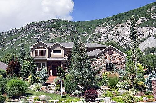 Gorgeous Custom Home in upscale, very desirable Sandy neighborhood. Nestled at the base of the canyon. Breathtaking views, secluded yard with unique specimen trees & landscape, double waterfall into pond in back yard. & additional water feature in front yard, dry river bed, delightful sights, sounds & smells of nature. 4 bedroom home with room to grow in basement. Knotty Alder cabs, Granite counter tops, hardwood & travertine. Great home for entertaining or relaxing. Original owner. Shows pride of ownership.
