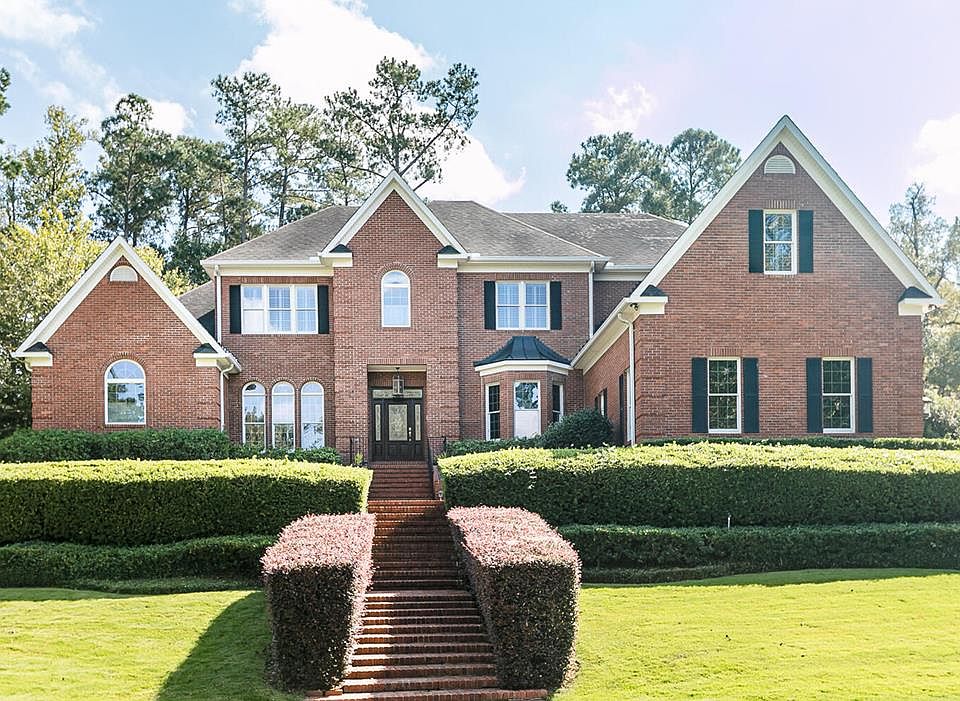A stately European style brick home rests on a quiet and picturesque lot in Jones Creek conveniently located just minutes from Evans Town Center. The landscaped yard, brick front steps, and a 3 car garage lend to the appeal of this regal stunner. Enter the foyer to find a luxurious, open concept main level. The wood floors, white columns, detailed trim, and a 2 story ceiling give this home unique character combined with traditional elegance. Large windows and recessed lighting create an airy and spacious quality to the home. Turn the corner to find a 2nd living space on the main, a breakfast room, and a kitchen with granite counters, travertine tile, and a walk-in pantry. The main level owner suite features vaulted ceilings, a large tiled bathroom with sizeable walk-in shower, separate tub, toilet room, and double vanities. Head upstairs to find a bonus room, 5 additional bedrooms including 2 master suites, and a huge laundry room. Step outside to the large back patio shaded by trees.