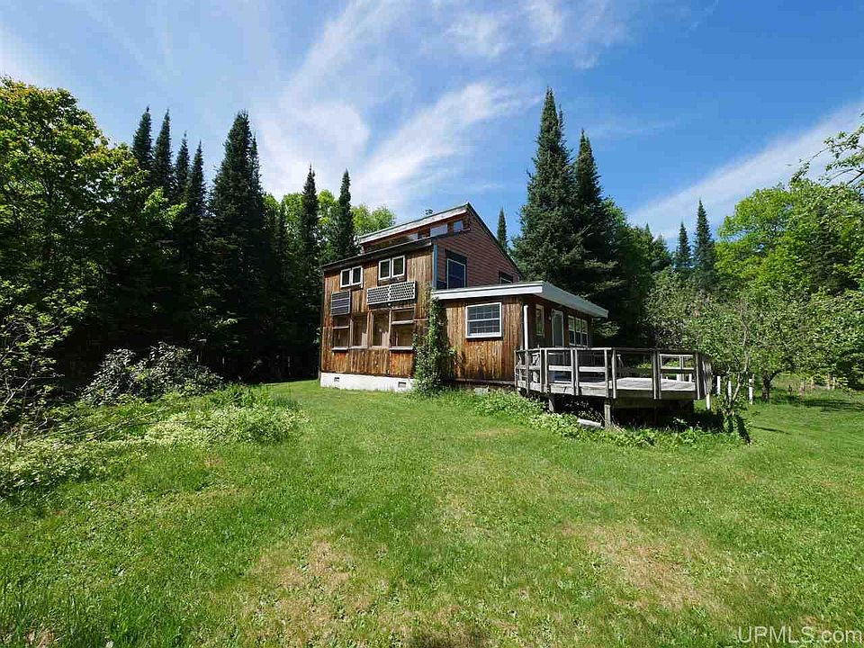 "Staying at home"? A request a video tour of this property! A gem in the Keweenaw for your personal retreat or maybe you are downsizing and want to make this 'tiny home' the centerpiece of your private park! The home is situated on approximately 22+/- acres just outside of Mohawk. The main floor has a nice entry area including a sitting room, living room with the propane space heater, eat-in kitchen and bathroom. Upstairs there is an office, family room (could be walk thru bedroom) and a private bedroom. Floors are mostly maple with some oak. The front entry has a closet that was previously used for the battery bank for the solar system. Additional buildings on the property include a 24x30 garage (built in 1998), garden shed, chicken coop and pump house. The pond on the property is fed from the cedar swamp in the area. The front porch has newer rolled roof. The yard has apple trees, flowers including rhododendron and attracts plenty of wildlife! The yard is cleared around the home but offers plenty of wooded areas to explore! The original design of this home was to be self sufficient with solar panels and passive solar heat. The solar panel system is not operational, has not been used for years and would need a battery bank. AND....don't forget all that the Keweenaw has to offer - Parks, recreational trails, Lake Superior, beaches, Mount Bohemia and more!