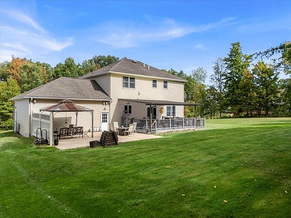 A standout custom-built two-story home! Perfectly situated on a quiet street lined with other quality-built residences. With over a 1/2 acre double-lot, this property offers the serenity to enjoy the outdoors. Inside, the heart of the home is the Oak kitchen showcasing granite countertops, a center island, pantry & ample countertop space for everyday living or entertaining. Beautiful wood trims, banister, and solid six panel doors. Downstairs, a comfortable family room with a Cherry cabinet granite top wet bar and a gas fireplace. Outside, a vinyl 16 x 12 shed, covered deck for inclement weather, stamped concrete patio, & pergola area perfect for privacy. More highlights include a two-car garage w/large loft storage & brand new epoxy floor paint. Thoughtful construction shines throughout with spacious well-proportioned rooms & quality classic finishes. A desirable location in the SV school district and room to roam, this home presents a great offering in today’s market. Easy to see!