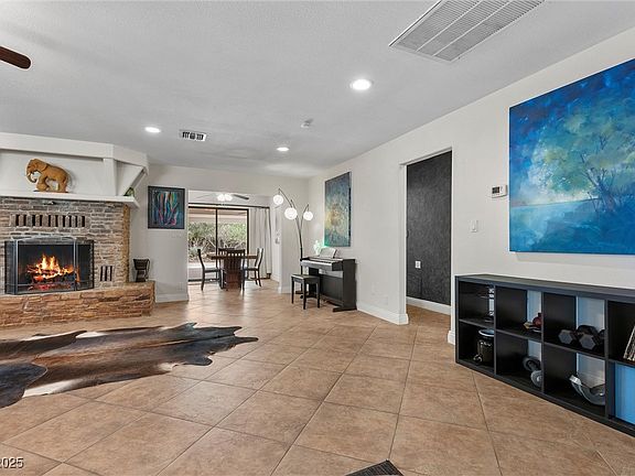 A Half-acre of freedom in the Southwest—no HOA and endless opportunities. Shielded by mature desert trees, this single-story retreat offers 2,535 square feet of refreshed living. Sun-washed great room gathers around a dramatic stacked-stone fireplace. The entertainer’s kitchen showcases Granite counters, custom cabinetry, stainless appliances and an island that seats five. Three generous bedrooms, two en-suite, deliver flexibility for multi-gen living or private guest quarters; the updated primary suite adds French doors to the yard, a bay sitting window, walk-in shower, Jacuzzi tub and dual vanities. Step outside to a full-length covered patio and botanical desert landscaping with meandering paths, raised planters and space prepped for a future pool or casita. Gearheads will love the 800+ square ft detached, drive-through garage - vaulted ceilings to accommodate RVs, boats or a lift-equipped car collection. Minutes to Allegiant Stadium, the Strip, Town Square and the airport.