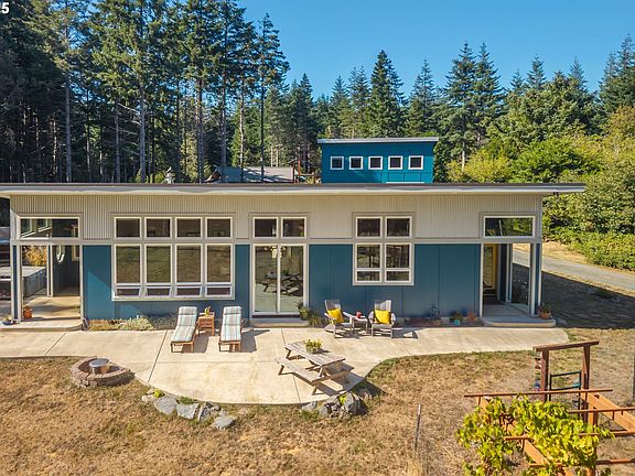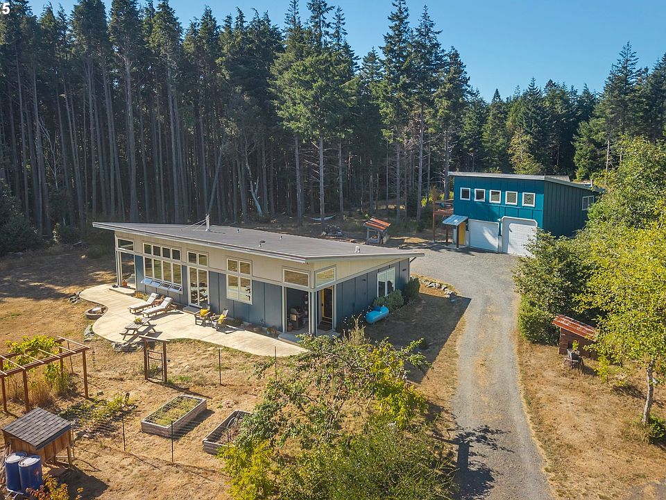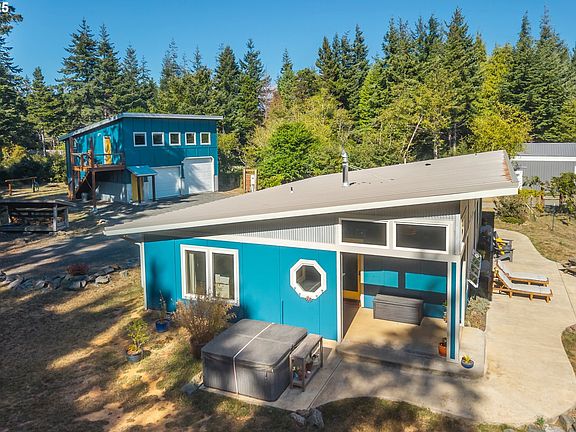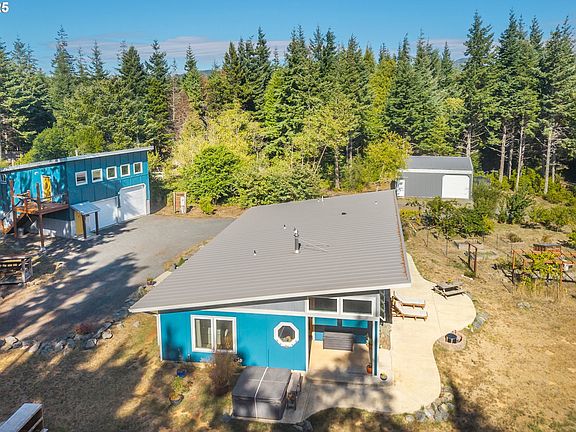 Discover this custom-built, single level, modern retreat, completed in 2019 and perched on 4.5 wooded acres just a short way from the beach. The main home boasts 1,707 sq.ft. of light, bright, open-concept living. 3 bedrooms and 2 full baths ensure flexibility for any lifestyle. The primary is a luxurious ensuite, highlighted by a stunning tiled shower, hand-crafted fir cabinetry and quartz countertops. Throughout, you’ll find wide CoreTech LVP flooring, custom solid wood doors and local sourced clear fir trim . Enjoy a chef’s kitchen with custom fir cabinetry, quartz counters, stainless KitchenAid appliances, Asko dishwasher, and a site-milled Port Orford cedar bar top. Gathering spaces flow seamlessly to a large, south-facing concrete patio and big, level lawn, ideal for entertaining. Garden area and trails for walking and biking wind through the pristine forest. Cozy up by the Hearthstone wood stove or stay comfortable year-round with dual Daikin mini-split systems. Beyond the main residence, the property includes a fully-equipped 600 sq. ft. ADU above a 30x28 workshop/garage. With its own address, entrance, deck, kitchen, bath, Daikin mini-split, and private parking, this space is ideal for guests, rental income, or multi-generational living. Infrastructure abounds: 400 amp underground service, broadband Internet, seamless metal roofing, new oversized gutters , UV water filtration and holding tank, propane hookup for grilling, ample trailer and RV parking, a 30x20 pole barn/shop, and 3 graveled trailer spots—all with a pull-through driveway for ease. After a day on nearby beaches and rivers , relax in the 4-person GardenSpas hot tub, where you can enjoy evenings beneath towering trees listening to the ocean. With fire-resistant siding, standing seam metal roofing, brand new paint , well designed drainage and more, this move-in-ready haven offers peace, end of road privacy and comfort, a world away from the ordinary, just minutes from the Oregon coast.