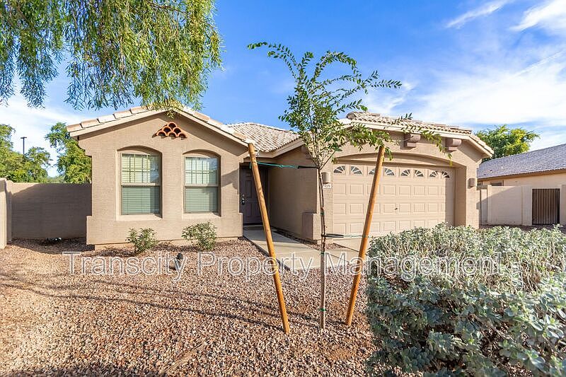 The front yard features low-maintenance desert landscaping. Inside, tile and carpet flow throughout the split floor plan, with three bright, well-sized bedrooms on one side and a private master suite on the other. The primary bedroom includes a roomy walk-in closet and a bathroom with dual sinks, great lighting, and ample storage.