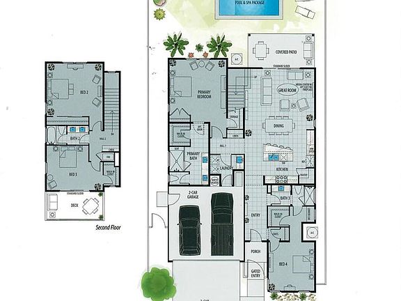 Swimming pool and spaView lotGourmet kitchenSleek cabinetryPorcelain tile flooringFull backsplashQuartz countertops
