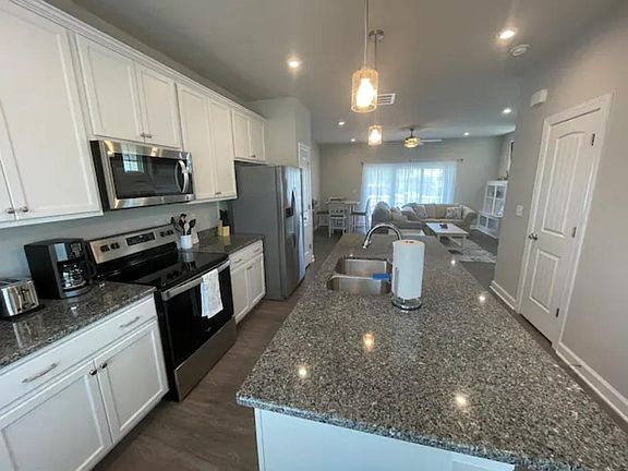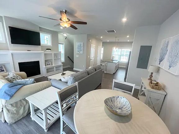 Bedroom #3 on the third floor contains a queen bed and a twin bed with trundle. Bedroom #4 is the master bedroom located on the 3rd floor and contains a queen bed. Bathroom #3 is on the 3rd floor and is a full bath with shower, double vanity sinks, and a tub.The open-concept living/ dining area and kitchen are perfect for gathering. Electric, water, sewage, cable/internet INCLUDED