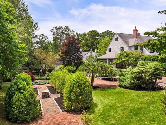 The Haven, circa 1890, is a charming estate in York Harbor featuring Victorian-style landscaping and a cobblestone circular driveway. The property includes a new brick patio with quiet spots for reflection and a covered entrance with a wide Dutch front door. Inside, the impressive entryway leads to a formal dining room with a fireplace, while the living and game rooms are to the left. A glass-enclosed porch opens to the side yard. The modern kitchen features new appliances and a family area, with easy access to the patio. Upstairs, multiple bedrooms, some with dressing areas, and bathrooms with tiled showers are available, including one with a clawfoot tub. A library with a fireplace adds to the charm, while the third floor offers an office and storage. The basement is transformed into a rustic speakeasy with a bar and gym. In the late 1990s, a carriage house was added, featuring a second-floor apartment, three garage bays, and a dog wash. The Haven is surrounded by beautiful gardens and is a short walk from Harbor Beach and the York River via the Fisherman’s Walk.