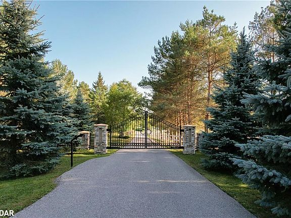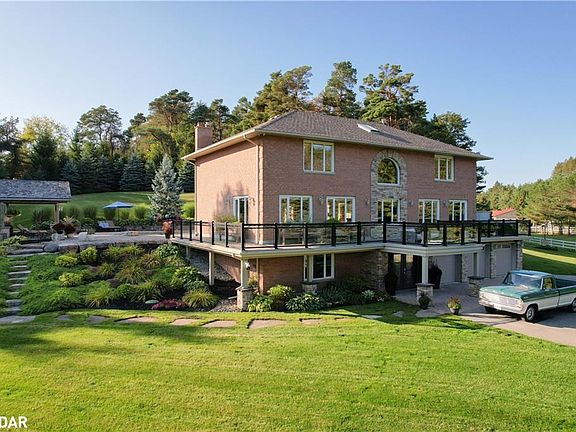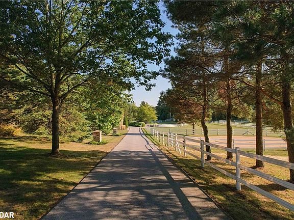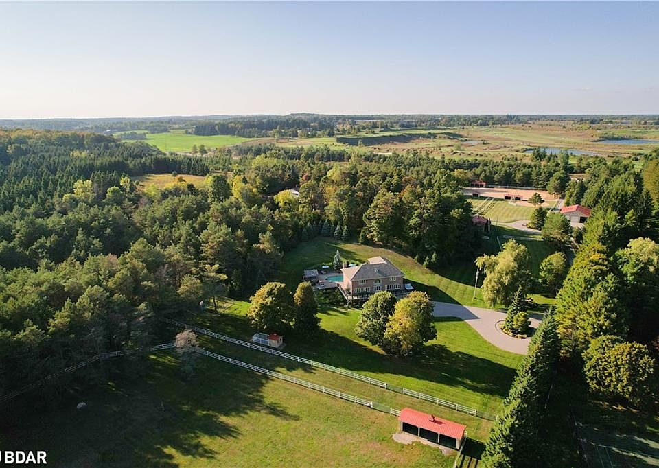 Enjoy sophisticated luxury on 10 private acres at this equestrian estate featuring abundant light, circular stair, crown molding, premium finishes, laundry on two levels, and heated floors in bathrooms, kitchen, and office. The spacious principal bedroom opens to a jaw-dropping opulent dressing room with illuminated cabinets and quartz top island. Principal ensuite includes dual shower, tulip tub, and two vanities. Guest rooms share access to dual-vanity ensuite with Jacuzzi and glass shower. Fourth bedroom / office is drenched in natural light and has custom cabinetry with one-piece maple countertop. Enjoy a chefs kitchen with WOLF range, indoor BBQ, steamer, double wall ovens, Big Chill appliances, and reverse osmosis tap. The massive dining room showcases a floor-to-ceiling wine wall; living area features coffered ceiling and wood fireplace with an adjacent great room boasting 17 ceiling. Lower level boasts a huge rec room, cedar-walled sauna, massive storage and mud rooms, dog wash station, and access to a 3-car heated garage with epoxy floors. Spa-like outdoor space has heated saltwater pool, outdoor shower, cabana, 6-person hot tub, and wraparound deck with glass rail & Duradeck floor. This haven for equestrians and outdoor enthusiasts has direct access to kms of trails. The four-stall barn includes tack room and frost free water tap. Horses can shelter in fan-equipped run-in sheds or enjoy one of 6 grass paddocks, sand ring, or round pen, all surrounded by FLEX fencing and electric braid. Never break trough ice again, with frost-free watering posts. Equipment can be stored in the huge drive shed with 11 foot doors, loft, and hay storage. Property has several perennial gardens, an aromatic retreat garden overlooking the North paddocks, all of which have auto sprinklers and landscape lighting. Enjoy ultimate privacy with the towering trees surrounding the property and with remote control entry gate and CCTV cameras. More details in attached Brochure.