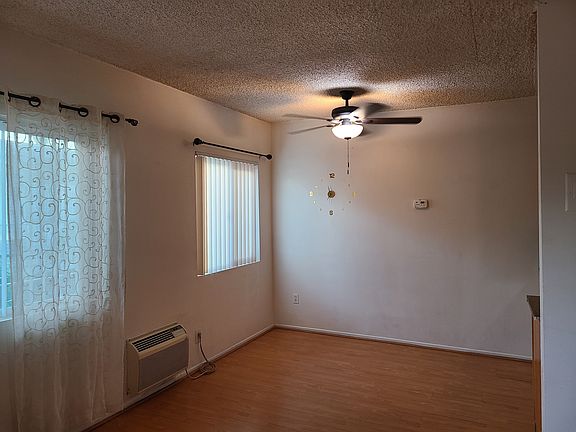 Dining area with ceiling fan; wall A/C unit;