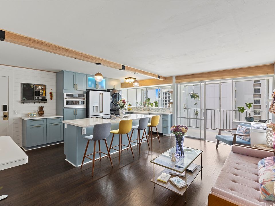 Every once in a while, a home comes along that just feels right—this thoughtfully upgraded 2-bed, 2-bath condo offers a perfect blend of warmth, elegance, and function. From the moment you walk in, you're greeted with rich wood floors, split AC, designer lighting, and a kitchen that stuns with its high-quality appliances, waterfall island, and custom cabinetry. The layout feels open and expansive, with floor-to-ceiling glass sliders leading to a spacious lanai—your front-row seat to breathtaking views: Ko'olau mountains and Ala Wai canal to your right, lush treetops and ocean peeks to your left. Enjoy Friday night fireworks from the comfort of home, or explore beaches, shopping, and dining just a short distance away. This pet-friendly building includes rare tandem parking, a rooftop pool, two new elevators and a location that offers all the perks of Waikiki living—without being in the thick of it.