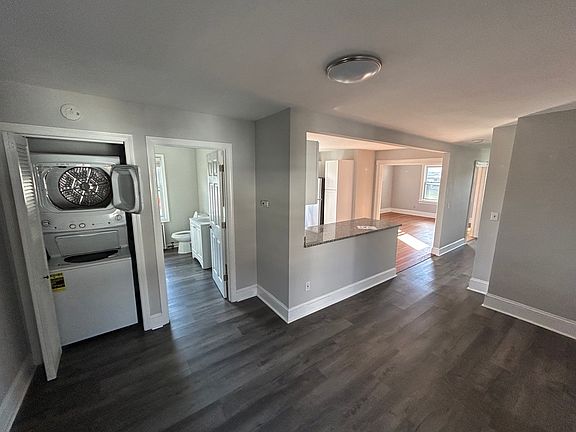 The apartment features a remodeled kitchen with granite countertops, stainless steel appliances, and ample cabinet space. The bathroom has been updated and includes a bright window overlooking the property. Both bedrooms offer large closets and refinished hardwood floors. The unit also includes a convenient in-unit washer and dryer.