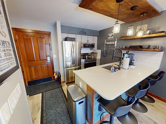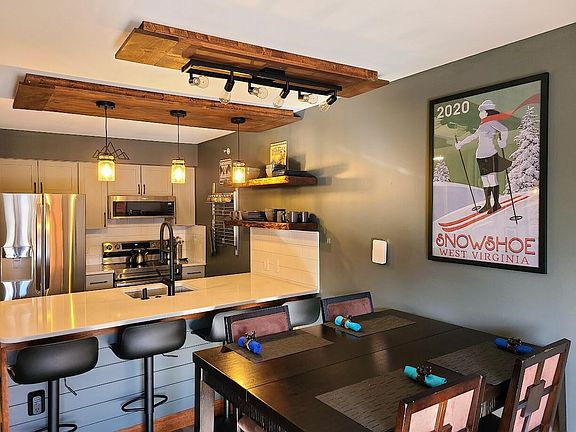 Remodeled top floor home with front row seats to all concerts and events in The Village of Snowshoe. Kitchen has been completely remodeled to include soft close cabinets, quartz countertops and high end appliances. Custom kitchen cabinets make it possible to fit a full size refrigerator with filtered water/ice maker, rare for village condos. 3'' thick live edge walnut shelves with custom ceiling light fixtures over the peninsula. Additonal bar area in living room with walnut counterop and shelving. Balcony has direct views of all village activities with a custom bar height table on wheels that will sit 4 . It is located at the end of the hall and top floor so no footsteps above you and only one wall is shared with another unit. Awesome place! Other upgrades include LVP flooring, floating bathroom vanity with matching wall cabinet, fireplace and HVAC system have been replaced within 3 years and there also is a high quality pull out sofas.