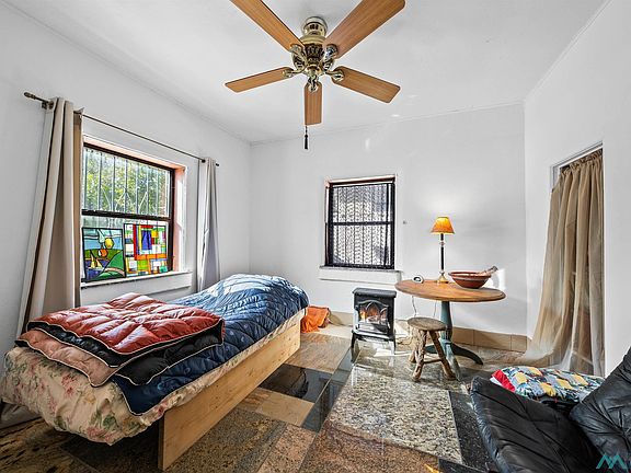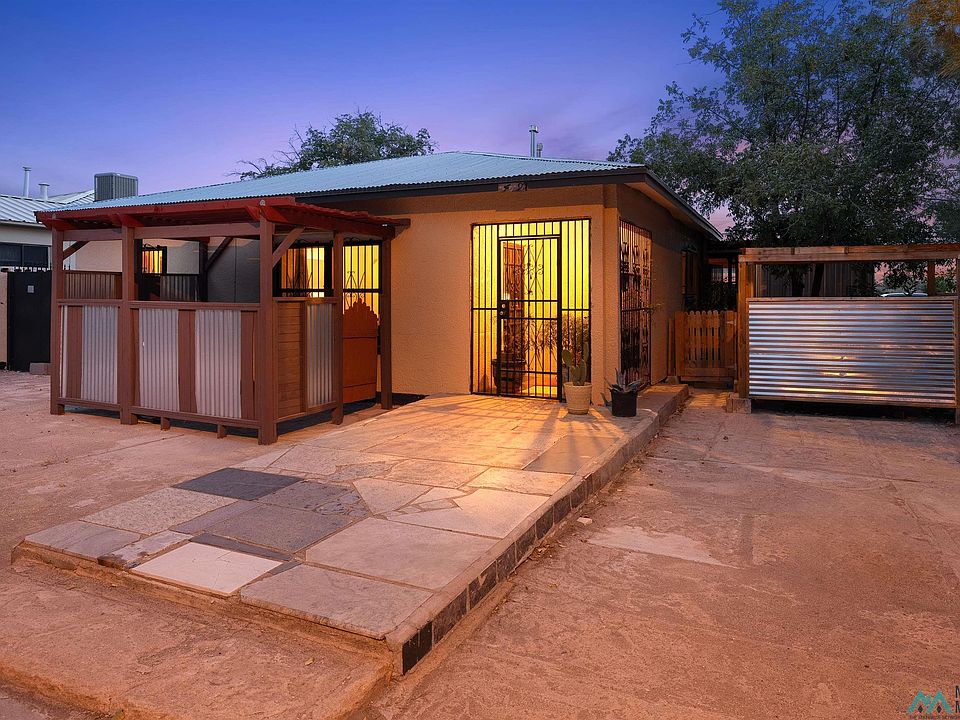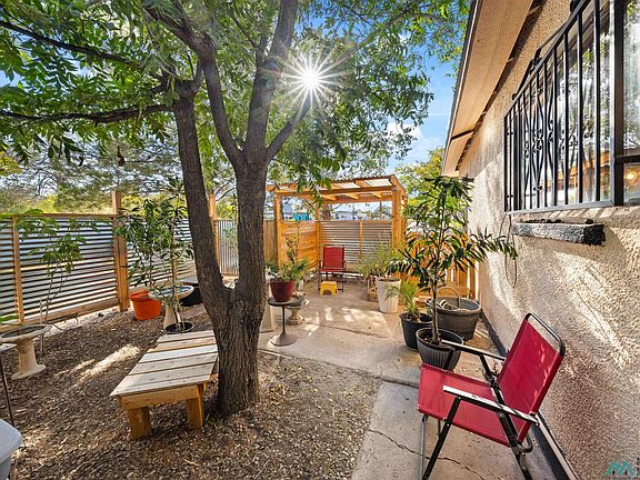 History and charm blend perfectly together in this inviting bungalow located on a corner lot in the heart of Deming. This 2 bed 2 bath home is the work of an artisan. A large living room with an abundance of natural light illuminates the hand crafted granite floors. There are two good sized bedrooms, including a primary bedroom with an en-suite bath. Right off the hallway, there is another beautifully tiled bathroom. The large kitchen features beautiful wood cabinets, lots of counter space, and a large pantry. Also included are a laundry/utility room, gas heating, and an evaporative cooler. Enjoy the outdoor spaces with attractive wood and metal fencing and two outdoor storage rooms. The place is really impressive with a metal roof, off-street parking in the front and an extra deep covered carport that doubles as a patio in the back. There is an outdoor oasis in the fenced side yard, adorned with tall pine trees and a mature pecan tree.