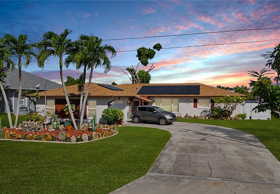 Opportunity awaits! This Gulf-access home is brimming with limitless potential and ready for a visionary buyer to reimagine it into a stunning waterfront retreat. Situated on an oversized double lot with beautiful intersecting canal views, this property offers direct boating access to open waters with only one bridge (9.6 ft clearance) between you and the Gulf. The home features three spacious bedrooms, each with walk-in closets, a large screened lanai perfect for future outdoor living, and solar panels (paid in full) for energy efficiency. Elevated in a Flood Zone X and surrounded by lush, mature landscaping, this full rehab original already has a 1-year-old roof and a solid foundation for transformation. With its unbeatable location near shopping, dining, and entertainment, this is the perfect opportunity for buyers looking to redesign a property with endless potential and create their dream home in the heart of Cape Coral.