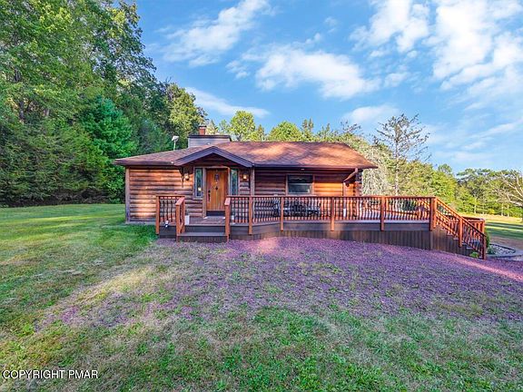 Inside, enjoy central AC, a stunning double-sided stone fireplace, and a spacious great room with a wall of Andersen windows that flood the home with natural light and overlook the serene landscape. The cabin highlights original exposed beams and classic character throughout.