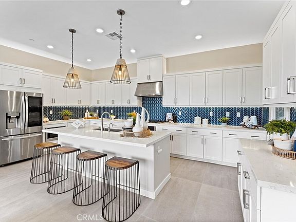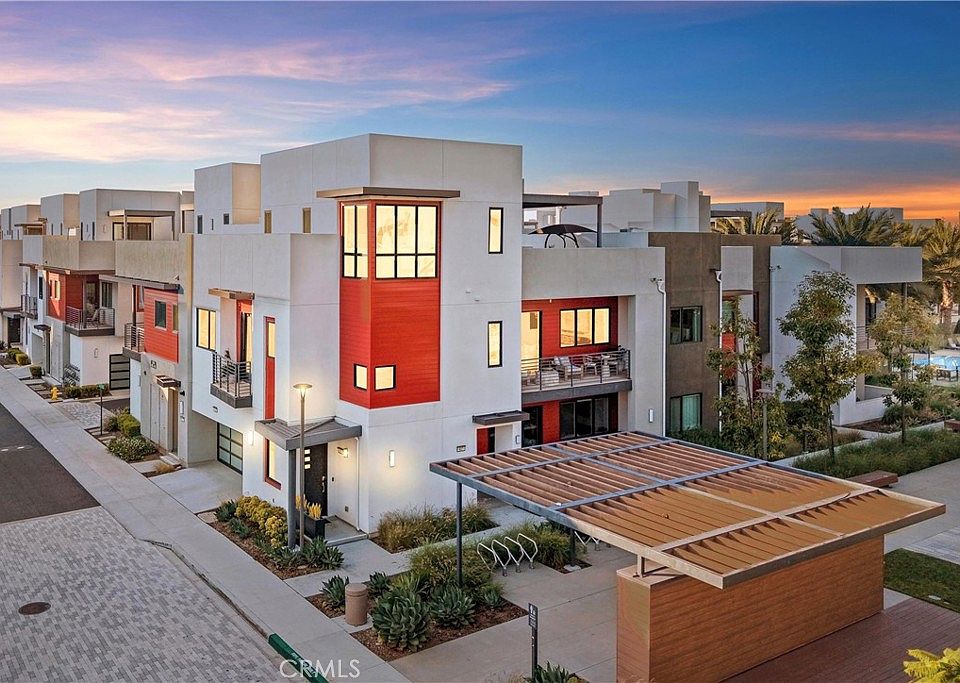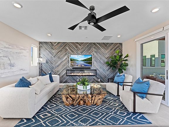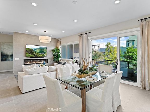 Welcome to 419 Transport in the Levity community at Tustin Legacy, a former model home with a premium corner location offering ample natural light and elevated views. This three-story, single-level living flat features 3 bedrooms, 3 bathrooms on the same floor, and a versatile third-level entertainment space that opens to a spacious rooftop deck. The 2,546 sqft home impresses with modern, designer finishes at every turn, from motorized roller shades and lighting to wallpaper accents, custom shiplap, and large-format porcelain tile throughout. The main level lives like a single-story home, with the kitchen, great room, bedrooms, baths, and laundry all situated on one floor. The expansive great room is anchored by a striking floor-to-ceiling tile fireplace wall and a balcony that overlooks the community area. The kitchen blends style and function with quartz countertops, a full herringbone backsplash, a walk-in pantry, GE Profile stainless steel appliances, pendant lighting over the generous island, and integrated under-cabinet lighting. All three bedrooms are thoughtfully positioned on this level, including a refined primary suite, a secondary ensuite bedroom enhanced by French doors that open to a charming Juliet balcony, and a spacious third room. The primary suite offers large windows, a feature wall backdrop, and an ensuite bath with a KOLER smart bidet toilet, an oversized walk-in shower with stacked glossy white subway tile, and hexagon mosaic flooring. The third floor features a bonus room with a dry bar and a charcoal-toned tile fireplace wall set in a modern herringbone pattern. The stacking doors open to the rooftop deck, ideal for entertaining, relaxing, or outdoor dining. Additional highlights include a 569 sqft two-car garage with epoxy flooring, storage cabinets, an extra storage closet, a tankless water heater, and an electric vehicle charger. Residents of Levity enjoy resort-style amenities, including a pool, spa, and barbecue area. The location offers exceptional convenience, with easy access to top-rated Legacy Magnet Academy, Victory Park, The District, Newport Beach, and John Wayne Airport.