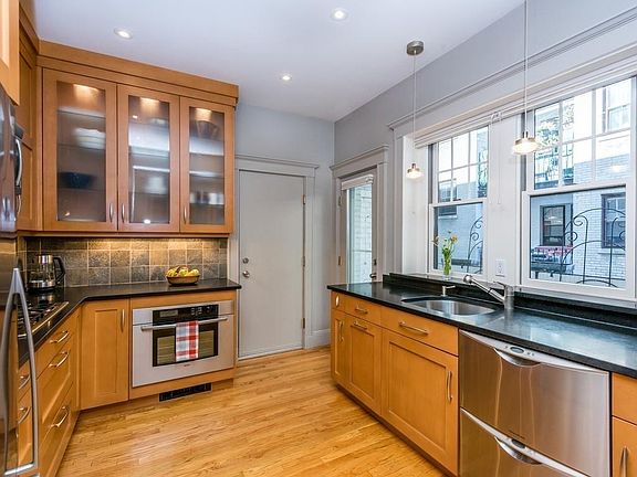Elegant sun-drenched condo with classic charm and verdant courtyard views. Crisp, clean and ready for its new sophisticated buyer. The open floor plan features: Spacious living room with archway - Custom kitchen with premium finishes and quality workmanship that includes abundant solid wood cabinets with pull-out shelves, silestone/granite counters, slate backsplash and stainless appliances - substantial master and second bedrooms, all with contemporary custom lighting. Other features include gorgeous oak floors, high end Hunter/Douglas blinds, Anderson replacement windows, updated electric panel, covered private balcony, and in-unit washer/drier.. All appliances, 3 AC units included. Large basement storage and 6 guest parking spaces too...Walk everywhere: C and D lines, Washington Square, Coolidge Corner, and Brookline Village. Just blocks to the Public Library, Pierce and Brookline High schools. OH SUN 3/17, 11:30-1:00.. Offers, if any, due 6PM Tues. 3/19..