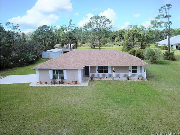 3 bedroom 2 bath home on pristine 2.83 acres. Land is cleared and pastured with kidney shaped pond. Block home offers open floor plan with cathedral ceilings, laminate flooring, french doors that take you out to a large screened in porch. Porch is great for sunset views or entertaining large crowds. Storage space includes double car garage, enclosed 18x31 metal barn with concrete floors, power and water; and large open pole barn 30x30, tall enough to store most RV's. This quiet country location is close to the river and minutes to New Smyrna Beach.