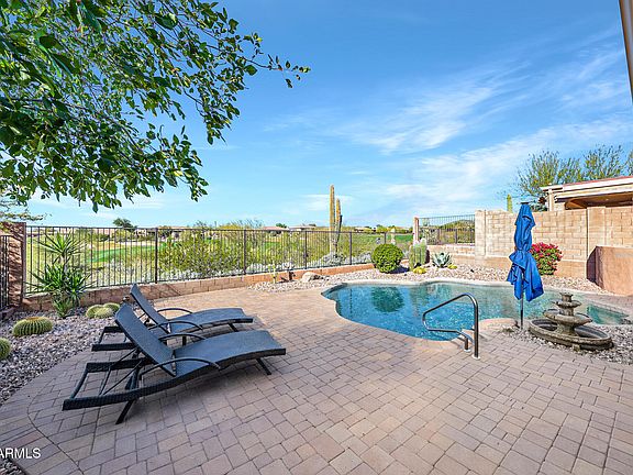 Step outside to your private backyard oasis, where a covered patio, sparkling pool, and extended paver decking overlook the lush fairway - perfect for morning coffee, sunset dinners, or simply soaking in the Arizona lifestyle. Additional highlights include a 2-car garage with built-in storage cabinets and a water softener for added convenience.