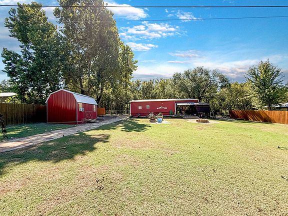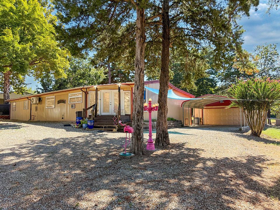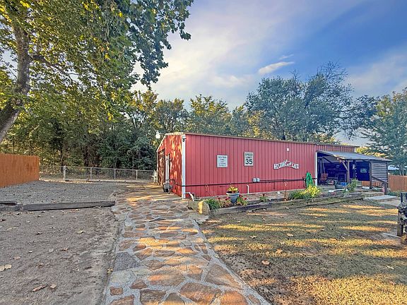 Welcome to this one-of-a-kind property - a custom metal home located just 1/2 block from Lake Eufaula, filled with handcrafted details, vintage charm, and thoughtful design throughout. Situated on two lots totaling approximately 0.55 acres, this property offers space, functionality, and endless character - perfect for full-time living or a weekend lake retreat. From the moment you arrive, you'll appreciate the inviting curb appeal with beautiful landscaping, flamingo accents, a detached two-car garage, and carport parking. Step into the vibrant patio sunroom featuring bold pink flamingo wallpaper and a gorgeous antique stained-glass window imported from Windsor, England, setting the tone for the craftsmanship found throughout. Inside, the main living area showcases custom pallet walls laid in a herringbone pattern, rich in warmth and texture, paired with beautiful tile flooring throughout. The open-concept layout features two living areas tied together with hand-milled cedar trim and a cedar beam that defines the space between the living and kitchen areas. The kitchen flows beautifully into the main living area, offering plenty of room for gatherings. Just off the kitchen, the custom Butler's pantry crafted from cedar adds both function and continuity. All kitchen appliances in the main home and shop remain with the property. The dining area is a showpiece with 100-year-old saloon doors, handcrafted cedar accent walls, and an antique stained-glass window from Louisiana that fills the room with colorful light. A sliding barn door leads into a cozy office ideal for remote work or study. This home includes four bedrooms and two full bathrooms. The primary suite offers a spacious layout, huge walk-through closet, and a stunning bathroom featuring hand-thrown ceramic sinks, hand-painted in South Africa, and a clawfoot tub. The secondary bathroom includes a Jacuzzi tub for a spa-like retreat. The fourth bedroom showcases built-in industrial-style bunk beds that remain with the home. The oversized mudroom/laundry area is both practical and beautiful, highlighted by Cypress wood accents reclaimed from an 1800s Louisiana mansion and another antique stained-glass window. A 3.5-ton HVAC system, installed just 2 years ago, ensures year-round comfort. Out back, the property transforms into a private retreat. Custom rock pathways wind through the yard, leading to a rock fire pit, a fully equipped studio building with heat and air (perfect as a she-shed, creative space, or extra storage), and an outdoor shower and sink just outside the back door - perfect for rinsing off after a day at the lake. Follow the pavers to the shop with full living quarters - a versatile space with a kitchenette, full bath, and open-concept living area. The custom bar, made from hand-carved African wood, adds global craftsmanship and warmth. Step out to the covered patio and enjoy peaceful mornings or relaxing evenings. On both sides of the shop, there's ample parking for boats, RVs, or lake toys, with a large gated entry from the road for easy access. The north side features a dedicated RV hookup, adding convenience for lake life. Blending historic character, modern comfort, and one-of-a-kind charm, this home offers custom design, global craftsmanship, and unbeatable proximity to Lake Eufaula. Homes like this are rare - schedule your private showing today!