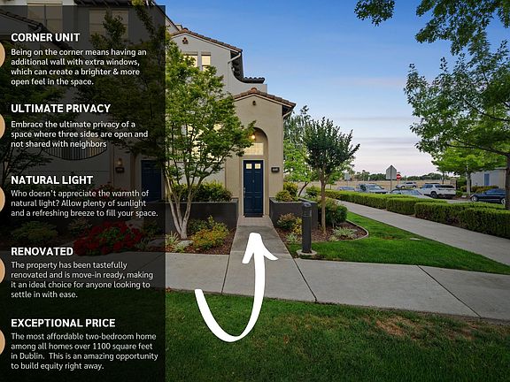 This beautifully updated end unit is a rare find, filled with numerous windows that allow natural sunlight and a refreshing breeze to flow in. Embrace the ultimate privacy of a space where three sides are open. All living areas are conveniently located on one level after you ascend the stairs. Revel in the morning sun from the eastern-facing living room, and unwind with breathtaking sunsets from the western-facing master bedroom. Enjoy the delightful balconies, perfect for sipping coffee or grilling as you soak in the tranquility around you. The generously sized bedrooms offer versatile spaces to suit your lifestyle. Ideal for commuters, this home offers seamless access to the freeway and BART station, while essential amenities such as grocery stores, parks, and schools are just a short walk away. Experience a lifestyle enriched by access to a vibrant clubhouse, a serene pool, and an inspiring gym, empowering you to focus on what truly matters.
