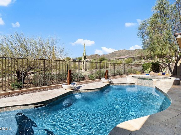 Step outside to enjoy a resort-style backyard designed for year-round enjoyment. The covered patio includes custom roll-up sun shades, while the sparkling pool and spa are surrounded by low-maintenance desert landscaping and view fencing that capture stunning golf course and Daisy Mountain vistas. A four-car garage with insulated doors provides generous storage and convenience.