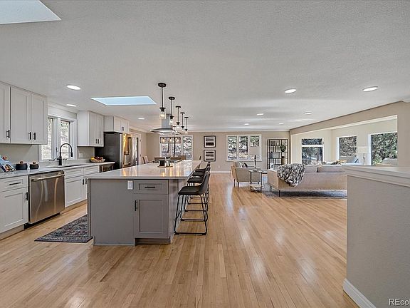 Spectacular home located in the coveted Hiwan Hills neighborhood. Completely remodeled from top to bottom including a new roof and skylights. The interior boasts a new kitchen with new appliances, wood floors throughout the main level, an open floorplan with an abundance of natural light. New wood floors in the primary suite, updated bath along with a generous walk-in closet. Family room includes a fireplace to take the chill of the winter evenings, new carpet and a wet bar for entertaining. The lot is just under one acre and includes a fenced area that can be used as a dog run, flat area for either a playground or garden and a water feature. Other features include natural light in the oversized garage, separate workshop / shed, deck area with power for a hot tub and radon mitigation system already installed. Conveniently located within walking distance to Evergreen Lake and historic downtown Evergreen don’t miss the opportunity to own this move in ready home!