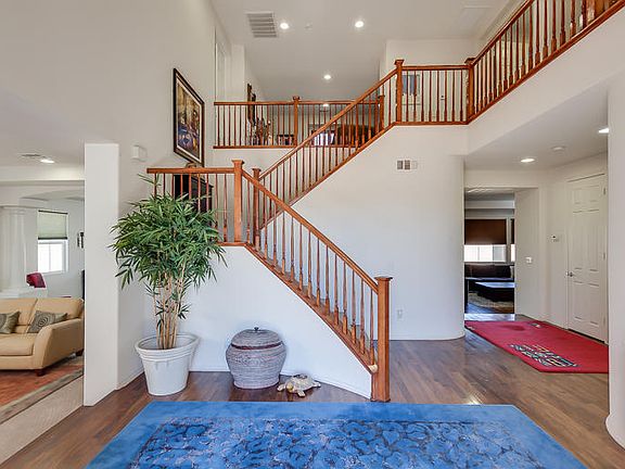 Located in a quiet Quartz Hill neighborhood, this graceful home boasts luxury upgrades throughout the 4,128 square feet of elegant living space. The double door entrance opens to stunning hardwood flooring and an impressive staircase with gorgeous wood bannister. Stepping down from the entry, the formal living room boasts intricate architectural features leading to the formal dining room with a coffered ceiling. Built-in appliances, dark granite, stylish cabinetry, a sunny breakfast nook and an enormous island with sink and breakfast bar set this gourmet's kitchen apart. The model-home-like family room enjoys a natural stone fireplace and raised hearth, a large media niche, recessed lighting, coffered ceiling and stylish window treatments. A sizeable bedroom and full bathroom complete the ground floor. The master suite highlights the second floor beginning with vaulted ceilings, a sitting area and private balcony with a view of Quartz Hill off the sleeping area. The master bath is accented by natural stone tile at the jaccuzzi bath and separate oversized shower while dark granite adorns the dual vanity and separate dressing vanity. A versatile bonus room over the garage can serve a variety of purposes such as game room, study, home theater, play room, etc. In addition, a large open loft is just off the landing. Two additional bedrooms sharing a full bathroom with granite topped vanity round out the second floor. Outside in the spacious backyard includes a free standing patio cover over the hardscape that wraps around the home. Finally, a useful room at the front of the home with outside entrance provides opportunity for an exercise room, music room or extra storage.