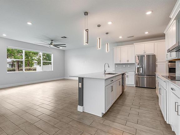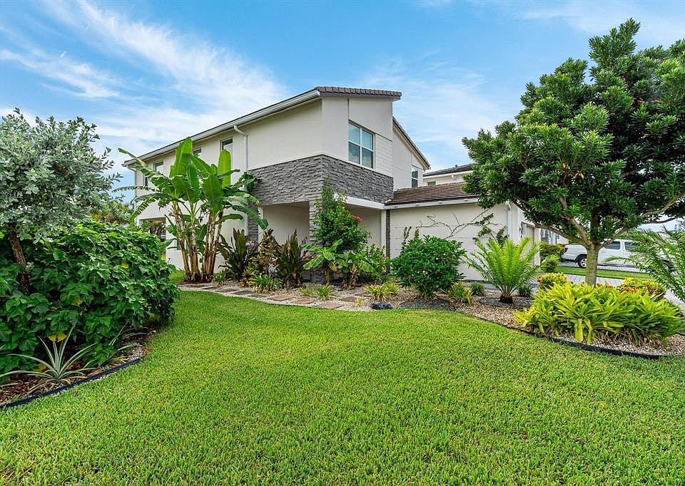Deluxe Home in Gated, Pet-Friendly Veleiros! Unique Rioja Model is 1 of the rarest & most desirable floorplans on XL Lot. Covered entry opens to foyer & 1st floor bedroom suite, then onto separate dining & great room. Open-plan kitchen w/stainless steel appliances/wall oven+microwave/cooktop+hood, quartz counters+island, pantry & hall to 2-car garage. Covered paver patio opens to sizable yard. Lawnmowing included. Upstairs, master suite spans width of home w/master bath feat. dual sinks & step-in shower + walk-in closet/dressing room. Bright bonus loft perfect for den/home office. Laundry room & 2 more bedrooms + guest bath on 2nd level. Ceramic wood-look tile in living area, LVP in bedrooms, impact windows & sliders, upgraded window treatments/lighting, SmartHome Features. Clubhouse/Pool
