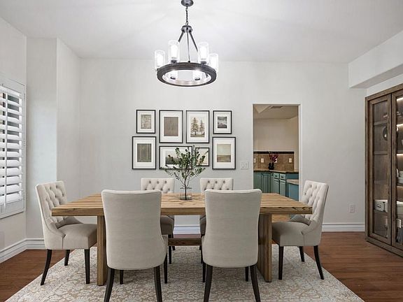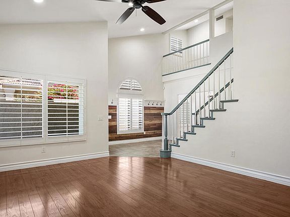 Located in a highly desirable Primrose neighborhood with no HOA. This beautiful family home has 4 bedrooms and 3 full bathrooms with a private in-ground saltwater pool and spa and front yard desert landscaping. Enter through double doors into a formal entry with a wood featured wall and an open floor plan offering a formal living room with vaulted ceilings, formal dining area, gourmet kitchen with granite slab counters and stainless steel appliances. There's breakfast bar seating opening into a large family room with a fireplace and built-in wet bar with granite counter, 2 built-in desk areas, a bedroom with ensuite bathroom and a laundry room that completes the main floor. Upstairs you will find 3 more bedrooms including a massive primary suite with fireplace, a walk-in shower, soaking tub, and His and Hers walk-in closets and a wrap-around balcony with panoramic mountain views. There are 2 more bedrooms that also access the balcony and there is a full size hall bathroom for the secondary bedrooms to share. This home also features plantation shutters throughout, french doors, ceiling fans, dual A/C, Wainscoting, recessed lighting, an attached 2-car garage with electric car plug-in, and a bonus room in the garage. The private back yard has a gated saltwater pool and spa, side yard with covered patio, artificial turf and cement area -- this is a perfect space for entertaining. Schedule your private tour today. Mortgage savings may be available for buyers of this listing.