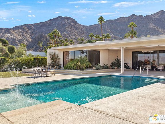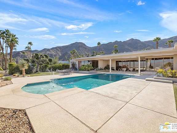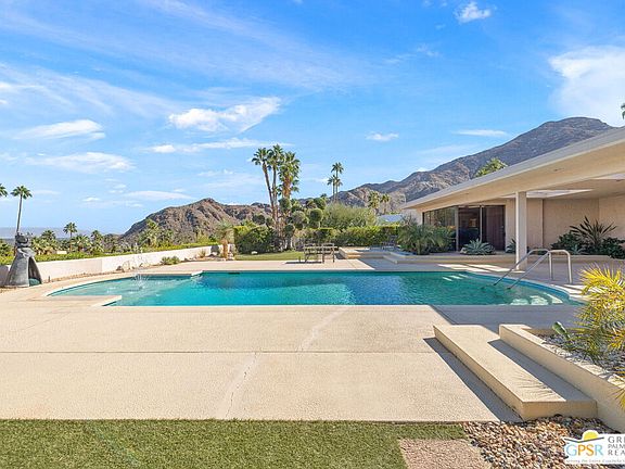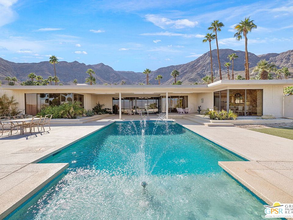 High atop the gates of Thunderbird Heights, this prominent mid-century modern residence captures the essence of exceptional modernist design. Set on a .62-acre flat corner lot, the home commands sweeping 180-degree views of the valley floor and 360-degree vistas of the surrounding mountains. A resort-style pool and expansive terrace are shaded by a perforated overhang that reflects the character of classic desert architecture. Inside, walls of glass frame uninterrupted views and bathe the interiors in luminous natural light. Guests arrive through a private motor court and carved double doors into a formal entry finished in travertine beneath a softly illuminated tray ceiling. The formal dining room is defined by a signature mid-century screen wall, while a marble-topped bar seating eight anchors the living area with views of the valley and Chocolate Mountains to the north. The kitchen, brightened by floor-to-ceiling glass, opens to a sunlit breakfast area with nearby butler's pantry, utility room, staff entrance, and bath. Two grand ensuite retreats occupy the east wing. The northeast suite features a sitting area with fireplace, direct pool access, an expansive walk-in closet, and marble bath opening to a private breeze block courtyard. The southeast suite offers floor-to-ceiling shelving and cinematic views of the Santa Rosa Mountains rising just beyond the property. Both retreats enjoy walled garden spaces framed in modernist breeze block. A third ensuite guest bedroom, privately positioned at the opposite end of the residence, features its own garden patio and full bath. Completing the home is an oversized, air-conditioned garage with golf cart parking and generous lockable storage. Thunderbird Country Club endures as an icon of desert glamourthe Coachella Valley's first 18-hole golf course, established in 1951, and a magnet for Hollywood legends, U.S. presidents, and tastemakers who helped crown Rancho Mirage the famed Playground of Presidents.