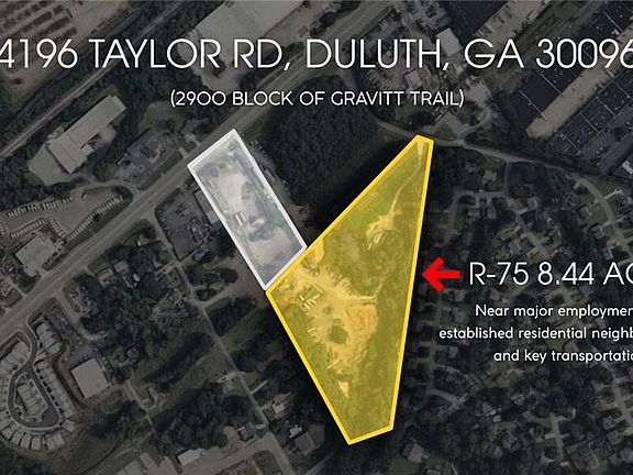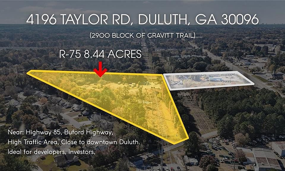 Excellent residential development opportunity in the heart of Duluth. This 8.44-acre R-75 parcel is positioned just off Buford Highway and offers a prime setting for townhomes, build-for-rent communities, or infill residential development. The majority of the property is clear, gently sloped, and easy to work with, providing an efficient starting point for future construction. The site sits directly behind a 3.24-acre C-2 commercial parcel on Buford Highway (same owner, sold separately). Both parcels may be purchased together, creating a combined 11.68-acre assemblage ideal for larger-scale residential or mixed-use projects with commercial frontage. Located minutes from major employment hubs, retail corridors, and established neighborhoods, this property offers strong long-term growth potential within one of Gwinnett County’s fastest-appreciating submarkets. Ideal for builders, developers, or investors seeking a versatile, well-located residential site with optional commercial integration.