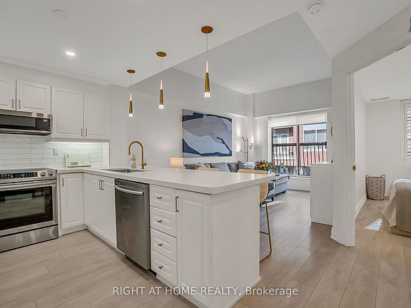 Welcome to Suite 205 at the Humber Lofts - an intimate boutique residence of only 24 units, ideally situated in the heart of Central Etobicoke. Enjoy the convenience of being only steps to Dundas St W, Bloor St W, shopping, cafes, transit, Royal York Subway Station, Lambton Park, and scenic walking and cycling trails along the Humber River. Beautifully renovated with contemporary finishes, this suite offers a bright and functional open-concept layout enhanced by new laminate flooring, high-profile baseboards and fresh, neutral tones throughout. The thoughtfully updated kitchen serves as the centerpiece of the home, featuring modern stainless steel appliances, abundant hardwood cabinetry accented with brushed gold hardware, chic beveled subway tile, upgraded pendant and recessed lighting, and quartz countertops with an extended peninsula for additional seating. The spacious living and dining area boasts soaring 10 ft ceilings and a Juliette balcony that invites an abundance of natural light. The stylish 4-piece bathroom has been fully redesigned with large-format porcelain tile, a modern vanity, and a glass-enclosed shower accented with gold fixtures. The serene primary bedroom offers a mirrored double closet, recessed lighting, and a large window complete with California shutters. Residents also enjoy access to the recently updated rooftop terrace, offering a peaceful outdoor retreat with lounge seating, gazebo, and barbeque area - perfect for relaxing or entertaining. Elegantly upgraded and lovingly maintained by its current owner, Suite 205 presents a rare opportunity to own a refined, move-in-ready home in a highly desirable community.