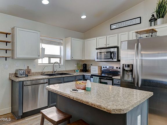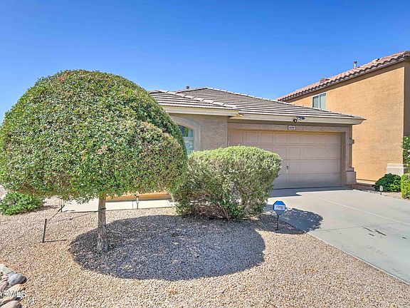 The eat-in kitchen is thoughtfully appointed with stainless steel appliances, granite countertops, a pantry, built-in microwave, and a convenient breakfast bar, perfect for casual meals and entertaining. Outdoors, the property impresses with mature landscaping, a covered a fenced backyard on the over 5,000 sq/ft lot, great for relaxing or enjoying gatherings. Residents also benefit from community amenities such as a heated pool, spa, playground, and walking paths. This home is ideally located near parks, a golf course, shopping, dining, and freeway access, offering effortless Arizona living in a friendly neighborhood.