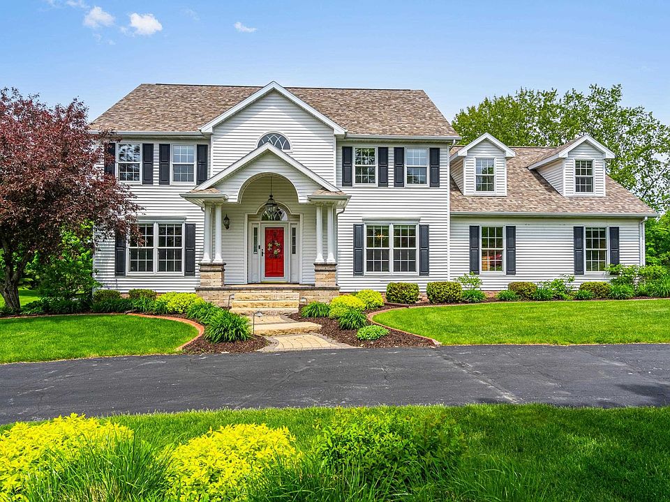 Magnificent, quality constructed 5 bedrooms, 3 ½ baths, 2 story walk-out vinyl home resting on a tranquil 5.3 acre lot in the popular Town of Ledgeview! Timely updates throughout, new shingles 2015. The blacktop circular driveway brings you to the attractive front entry and the nice 2 story foyer. There is a formal dining room w/crown molding & hickory hardwood floor. The living room also has crown molding & carpet. The open concept kitchen/dinette has granite counters, fully applianced kitchen & hickory hardwood floors! The comfortable open concept fami room has a floor to ceiling brick fireplace, pocket French doors & carpet floor. There is a half bath & convenient 1st floor laundry w/washer & dryer. Enjoy the insulated & heated, plastered 3 stall attached garage w/basement staircase.