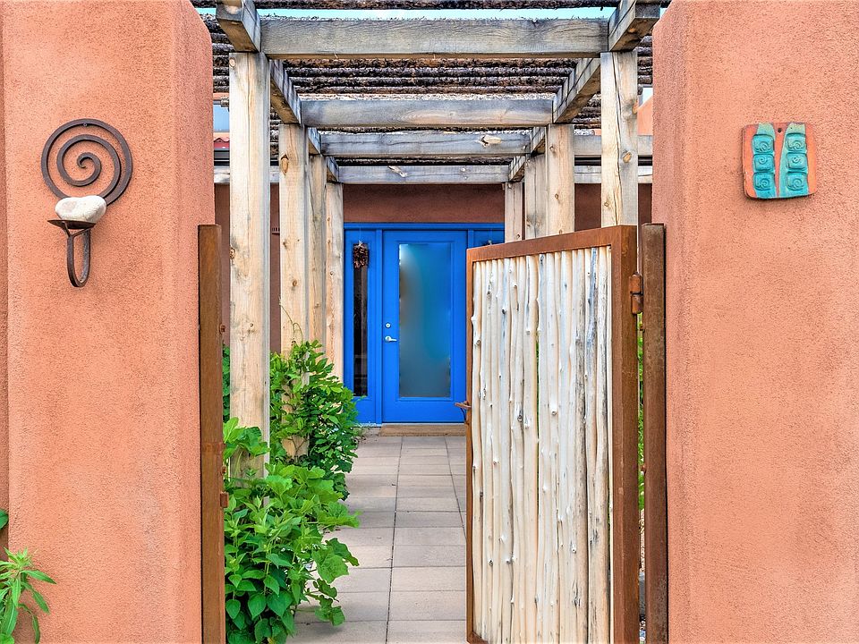Why postpone your Santa Fe future and lifestyle? This one level light-filled unique home is your opportunity. Features: 3 BD, 2 BA 2Car Garage 2141 sf home with AC, Fireplace, Studio and Office on 2 Greenbelt with BOTH Eldorado water and private well. Here you can sleep under a night sky of stars and awake to mountain views and a blue sky in a home surrounded by stucco walled courtyards filled with gardens and fruit trees and tranquility. What began as a pueblo style home has been transformed by a major interior remodel with an architect’s vision and artist eye into a functional, light filled soft contemporary home for Santa Fe living, creating and entertaining. An open concept 14-foot-tall ceiling, great room and dining area, with fireplace with 14-foot-tall ceilings encompasses a newer remodeled chef’s kitchen with views, outdoor patio access with hot tub and gas BBQ hookups. Primary bedroom is designed for privacy and ensuite with an updated spacious bath. Two guest bedrooms share an updated bath with tub, have mountain views and the benefit of clearstory high ceilings and natural light. The studio has beamed ceilings, natural light and opens to the front flagstone courtyard garden of inspiration. The new office designed for function and privacy has mini split and outdoor and courtyard access. Incredible Bonus! In addition to Eldorado community water and low HOA fees (570/year), you OWN a private well to nurture your garden imagination, trees and landscape. Plus you have a new gas line connection for efficient radiant heating and cooking. Your home is tucked into a greenbelt with trails and the benefits of the Eldorado Library, School, Senior center, Community Center with pool, dog park and easy access to everything important from local Agora Center shopping to services and only 20 minutes to Santa Fe Plaza, Galleries, Museums, Opera, Ski Basin, Markets, Medical Centers and more. The next move is yours. Schedule a showing and experience living here.