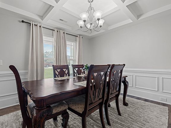Step inside the foyer to find hardwood style flooring and crown molding. An arched doorway leads into a spacious dining room with a coffered ceiling, chair-rail & picture frame wainscoting. Another arched doorway leads to the bright kitchen offering hardwood style flooring, white shaker panel cabinets, center island, decorative backsplash, and stainless steel appliances. The kitchen overlooks a breakfast nook with glass french doors that lead to a deck and then flows into the family room with a gas log fireplace. The staircase off the family room leads to the 2nd floor where you'll find a large primary suite with adjoining garden bath with 2 separate vanities with quartz countertops, a soaking tub and separate shower. Additionally there are 3 more bedrooms and a full bathroom. The backyard is fenced and perfect for family gatherings or just hanging out and relaxing.