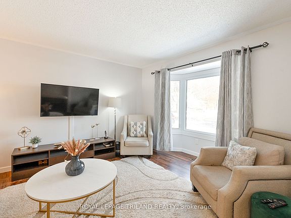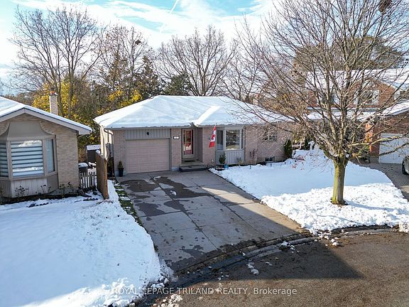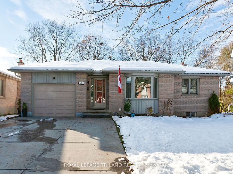 Welcome to 42 Benedict Court, a beautifully updated all-brick 2+2 bedroom bungalow situated on a spacious pie-shaped lot at the end of a quiet, family-friendly court in Northeast London. With its versatile layout, walk-out lower level, and modern updates, this home is ideal for families, downsizers, or those seeking excellent in-law suite potential.An updated concrete driveway provides parking for up to four vehicles, paired with an insulated single-car garage with inside entry. Inside, the bright formal living room is filled with natural light from the east-facing updated bay window and finished in luxury vinyl plank flooring. The open-concept main level continues with wood-look tile flooring flowing into the dining area and updated kitchen, featuring white cabinetry, subway tile backsplash, Silestone quartz counters, a moveable island, and access to the elevated deck through an updated sliding door.The main floor offers two generous bedrooms and a fully renovated 5-piece bathroom with dual sinks, a quartz countertop, tiled tub surround, and a warm wood-accent ceiling detail. The fully finished walk-out lower level provides exceptional natural light with oversized above-grade windows. The welcoming family room features laminate flooring and a charming brick wood-burning fireplace. Two additional spacious bedrooms and an updated 3-piece bath make this level perfect for extended family or guests. With its separate entrance potential, this space offers outstanding in-law suite possibilities. A large laundry and storage area complete the level. Additional updates include new gutters around the entire home. Located minutes from downtown London, Western University, Fanshawe College, parks, schools, and major amenities, this home combines quiet court living with exceptional convenience. 42 Benedict Court is move-in ready and full of potential. Don't miss it!