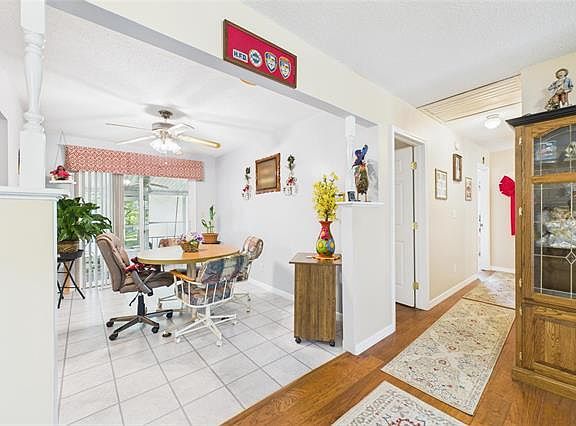 Large laundry roomCorner lotDining areaBuilt-in shelving and bookcaseScreened in patioHardwood and tile floors