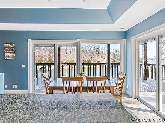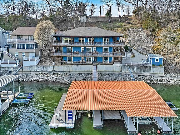 Luxury lakefront home for sale at the highly desirable 1 Mile Marker of Lake of the Ozarks. This turn-key 6-bedroom waterfront property spans three levels of beautifully updated living space and operates as a top-performing vacation rental. Enjoy panoramic main-channel views with the added benefit of cove protection—ideal for boating, swimming, and family fun. The home features three levels of living, two full kitchens, a built-in dance floor complete with entertainment lighting, and wall-to-wall lake-facing windows. The primary suite offers stunning water views, while multiple living areas and guest suites make the home perfect for large groups. Outdoor living shines with expansive decks, patios, and an easy walk to the private 3-well dock. A rare 4-car garage and flat parking provide unmatched convenience. Whether you're seeking a luxury lake house, a high-income vacation rental investment, or a premier Lake of the Ozarks retreat, this property delivers exceptional value, location, and waterfront lifestyle.